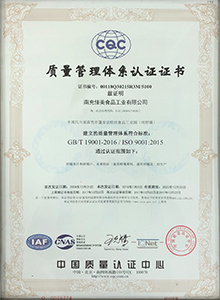 南充佳美于2008年按ISO 9000標準建立質量管理體系,同時取得ISO 9001質量體系認證證書,并于2018年取得ISO 9001:2015質量體系認證證書。